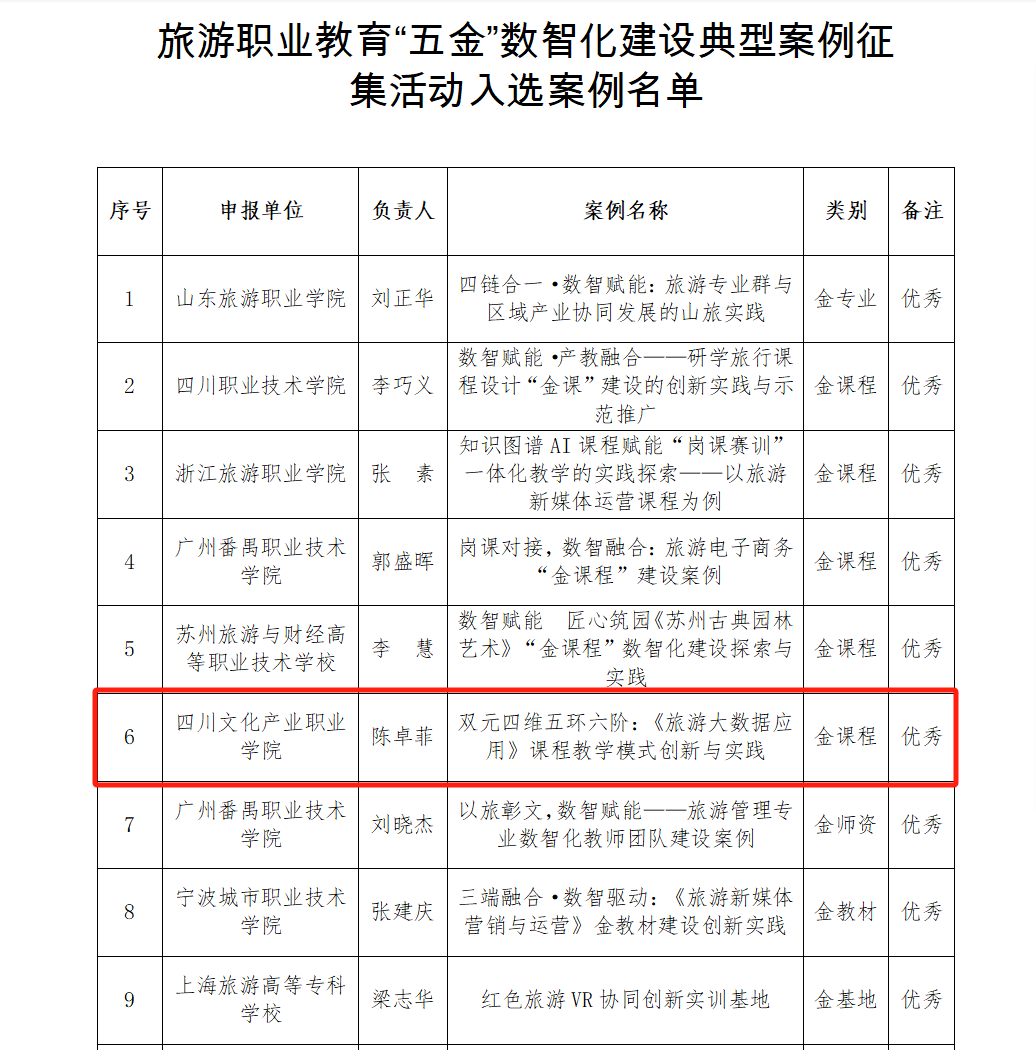 近日,文化和旅游部公布了2025年旅游职业教育“五金”数智化建设典型案例征集活动入选案例名单,我院陈卓菲老师团队申报的《双元四维五环六阶:<旅游大数据应用>课程教学模式创新与实践案例》成功入选金课程典型案例,并获评“优秀”。