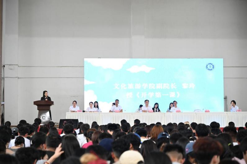 随后,专业教师代表送上开学寄语,老生代表为新生代表佩戴校徽、授予专业旗。新生代表曾芷涵发言并带领全体新生庄严宣誓《文旅新生入学文明公约》。