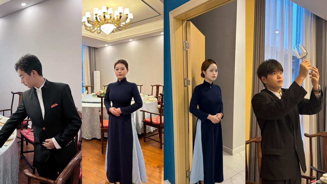 会议期间,学生们分工明确、配合默契。礼仪团队在嘉宾引导、揭牌仪式、授牌颁奖等环节中表现沉稳、举止得体;会务团队负责多个会场的茶水与点心服务,保障了会议流程顺畅有序;餐饮团队经过系统培训,高效完成了近80位嘉宾的用餐服务,展现了扎实的业务能力。