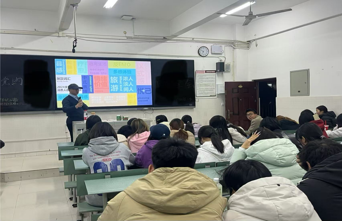 李正佐董事长围绕认知升维、业态创新、职业规划与未来展望四个维度展开讲授。他结合数字化与AI技术发展背景,指出文旅行业正经历深刻变革,传统服务模式亟待突破,未来人才需具备跨界整合与创新思维能力。通过剖析新兴业态案例,他强调复合型能力在职业发展中的重要性,并分享个人创业与从业经历,为学生规划成长路径、明确发展方向提供了实用建议。