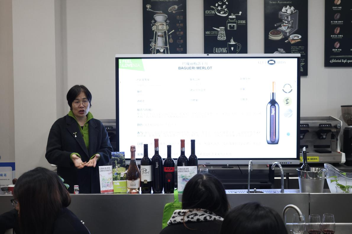 廖夏玲总监系统讲授了葡萄酒品鉴的基本流程与礼仪,指导学生从观色、闻香到品味,逐步感知葡萄酒的感官层次。她还结合斯洛文尼亚葡萄酒的风土文化与酿造工艺,分享了餐酒搭配的实用技巧。