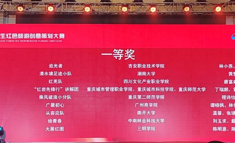 全国大学生红色旅游创意策划大赛以“红色导向、传承基因、不忘初心、面向未来”为宗旨,是全国规模最大、覆盖面最广、影响力最强的红色旅游专业赛,也是教育部全国大学生思想政治工作精品项目。组织学生参加红色旅游创意策划大赛,是我院“课程思政”的重要抓手。再次获得红旅大赛一等奖,是我院专业人才培养的又一成绩,也是学校“双高”建设的又一硕果。